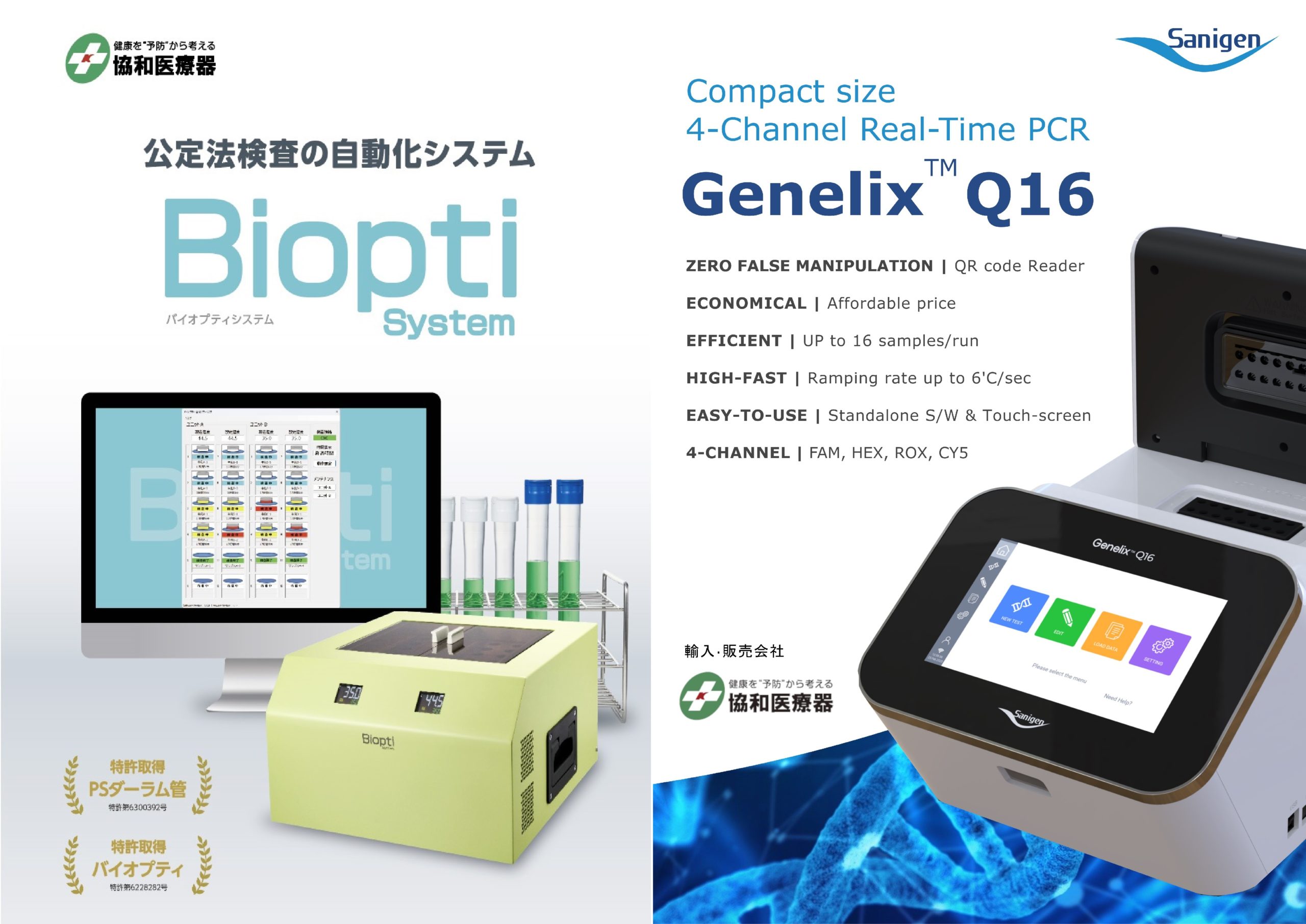 | 見所・特徴 | 1.「BioptiSystem」公定法の液体培地検査自動化システム BioptiとPSダーラム管入り液体培地がより使いやすくなりました。 特徴:「Biopti」1台で2つの温度帯を同時培養可能 「PSダーラム管入り液体培地」片手で開閉できるキャップ変更 2.「Genelix Q16」リアルタイムPCR検査機&検査キット 韓国食費用PCR検査キット販売実績1位のSanigen社製品です。 特徴:コンパクトサイズ/簡単な操作/マルチ4チャンネル |